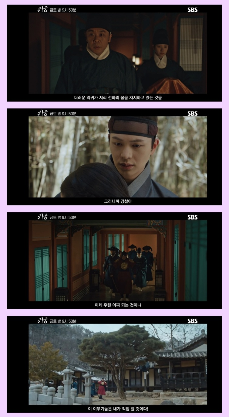 팔척귀는 군관에게 빙의하여 중전을 공격, 결국 중전과 태아는 목숨을 잃고 맙니다. 왕 이정은 이 충격적인 사건에 깊은 슬픔과 분노를 느끼며 배후를 추적하기 시작합니다. 강철과 여리는 중전이 지니고 있던 경귀석이 무력화된 사실을 확인하고, 그 배후가 김응순임을 알게 됩니다. 김응순은 가족을 지키기 위한 행동이었다며 항변하지만, 결국 비극적 결말을 맞이합니다. 동시에 풍산과 대비가 팔척귀를 숭배하며 왕실 전복을 시도하고 있다는 사실도 드러납니다.