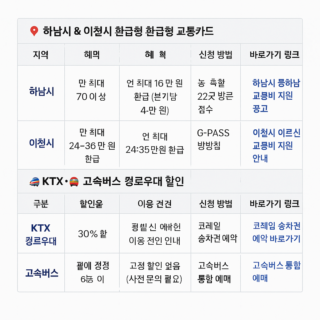 | 하남시 | 만 70세 이상 | 연 최대 16만 원 환급 (분기당 4만 원) | 농·축협 22곳 방문 접수 | 하남시 통하남 교통비 지원 공고 |