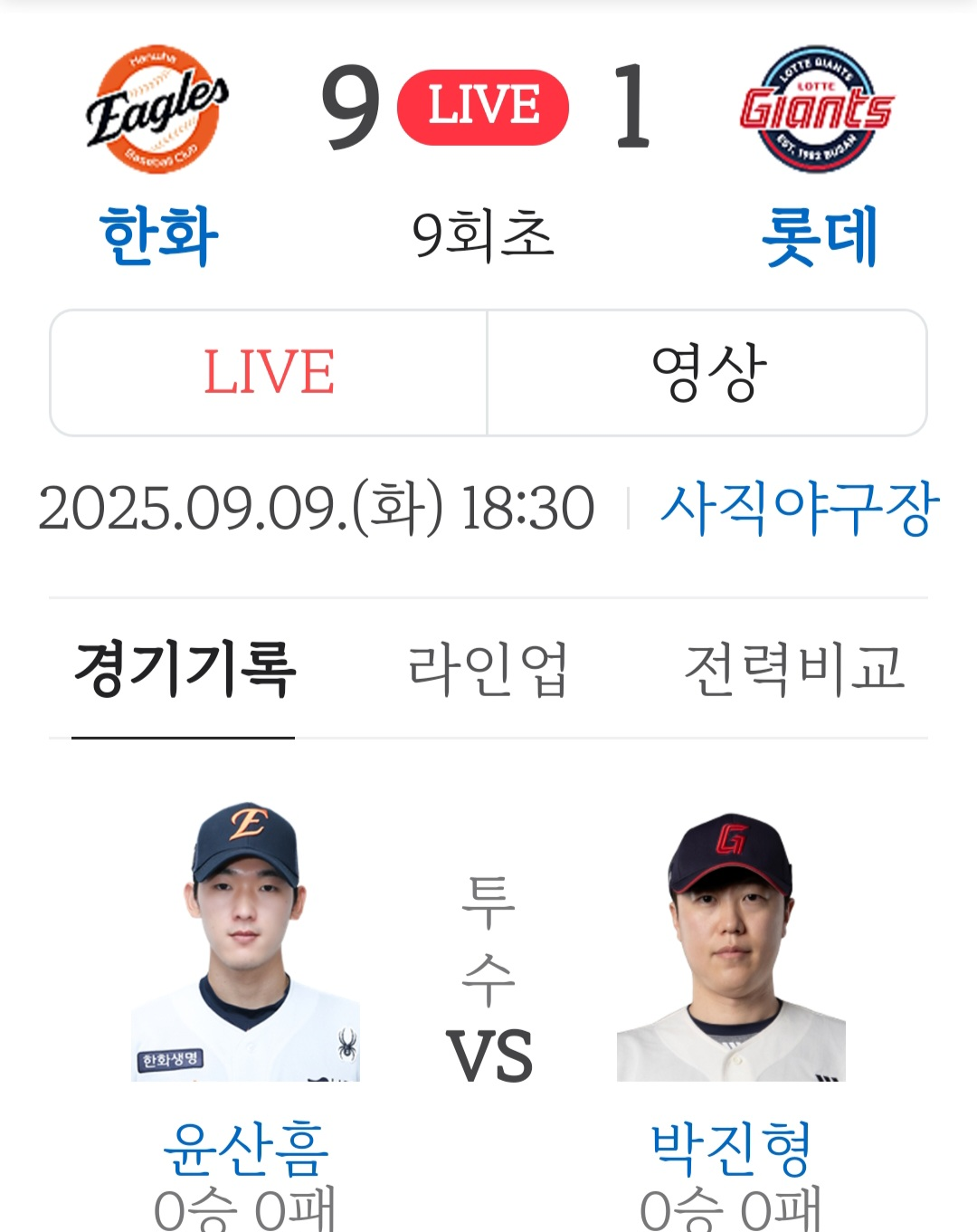 일시: 2025-09-09 화 18:30 · 장소: 사직야구장 · 선발: 한화 와이스 / 롯데 정성종