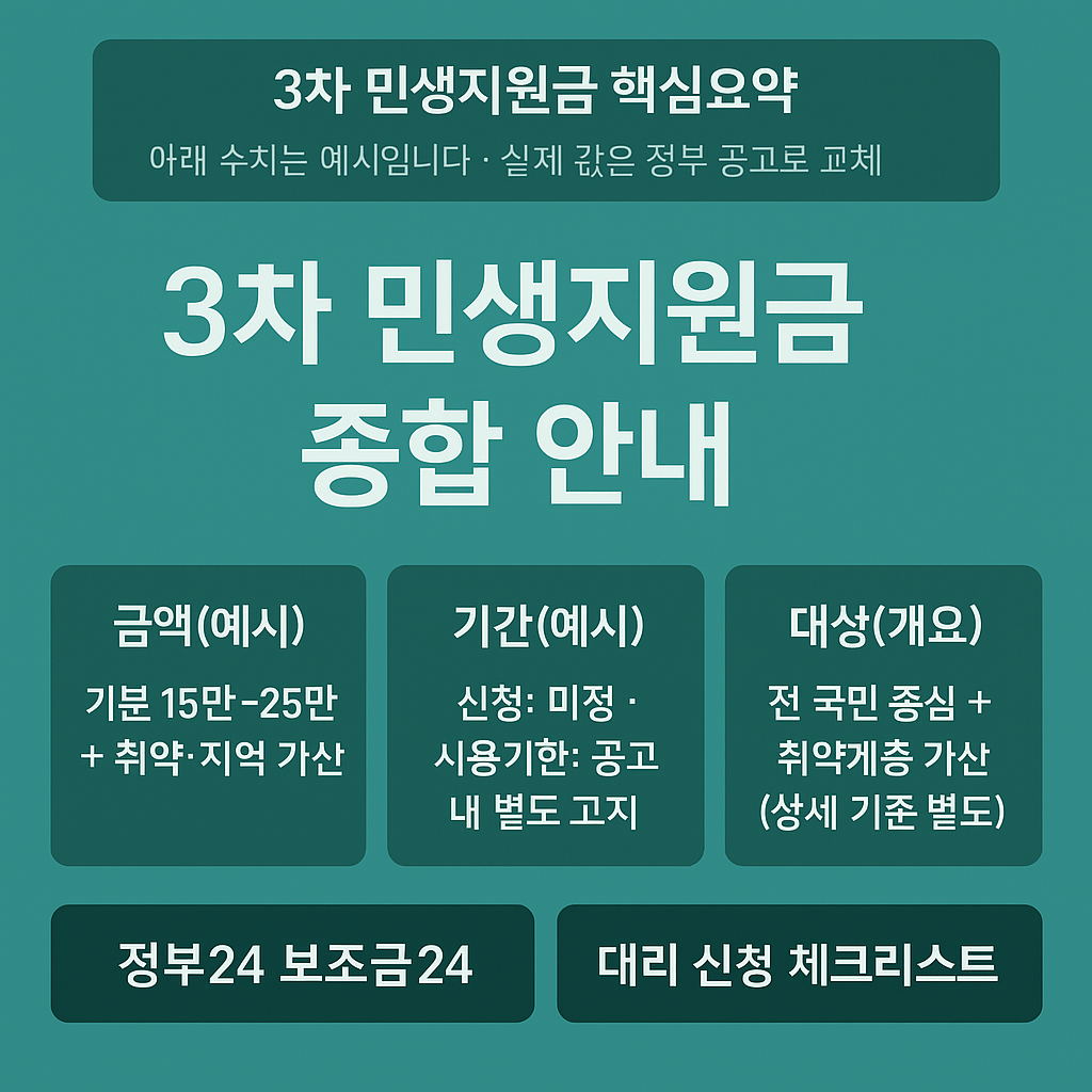 알림 · 3차 민생지원금은 정부의 공식 확정 전까지 아래 구조를 템플릿으로 사용하세요. 실제 금액·기간·대상·신청처는 공고 발표 후 교체하시고, 사칭 문자(스미싱)에 주의하세요.