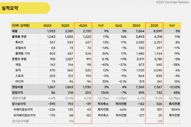모든 지표가 장밋빛인 것은 아닙니다. 카카오의 또 다른 성장 축이었던 콘텐츠 부문은 다소 아쉬운 성적표를 남겼습니다. 특히 웹툰과 웹소설을 담당하는 스토리 부문의 매출이 전년 대비 5% 감소하며 성장 정체기에 접어든 모습을 보였습니다. 글로벌 시장에서의 경쟁 심화와 마케팅 효율화 과정에서 발생한 일시적 현상으로 풀이되지만, 카카오로서는 새로운 성장 동력이 절실한 시점임을 보여줍니다.