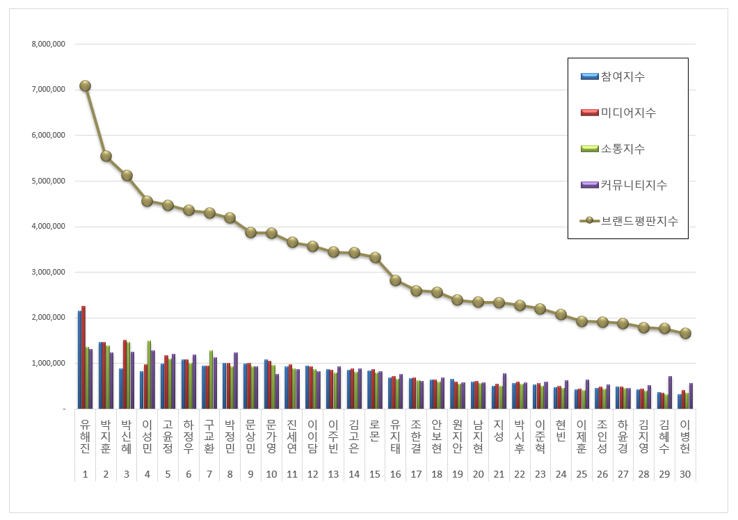 유해진 브랜드는 참여지수 2,152,323, 미디어지수 2,256,100, 소통지수 1,361,811, 커뮤니티지수 1,317,803으로 브랜드평판지수 7,088,037을 기록했다. 최근 영화 흥행과 함께 ‘천만 배우’의 저력을 다시 보여준 점이 높은 평가로 이어졌다는 분석이다.